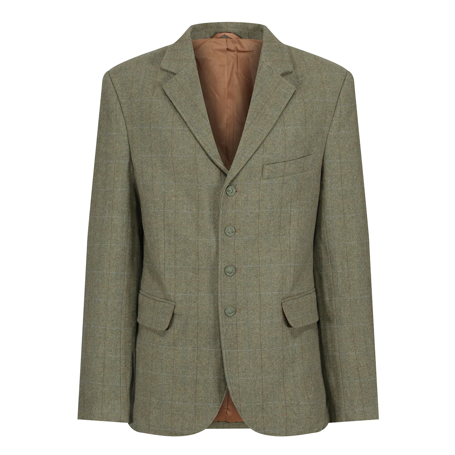 Exclusive Equetech® Green herringbone tweed with subtle Red, Orange and Blue overcheck. Perfect for all equestrian activities including Showing, Cubbing and Riding Club activities. Features include Flap pockets with concealed zip pockets, rich gold Equetech® jacquard lining, rich self fabric collar and pocket welts, chest pocket, foxhead buttons and double back vents. 60% Wool/ 40% Polyester. 400gsm.