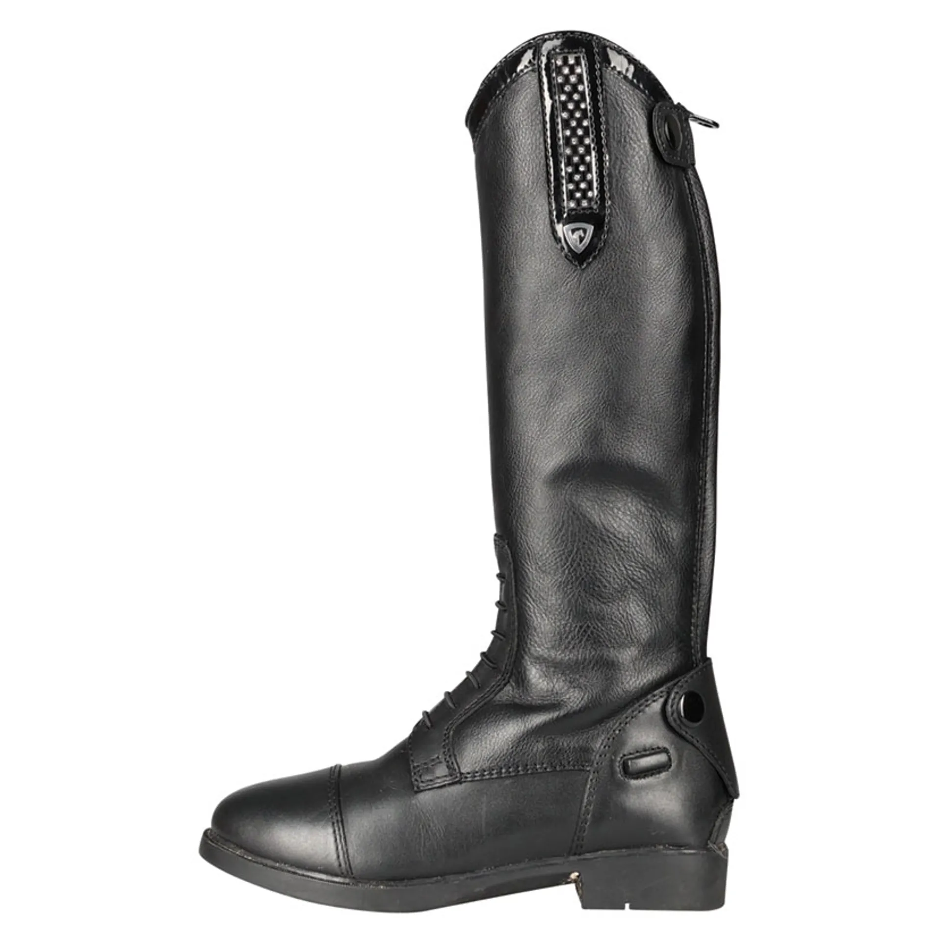 Add a touch of sparkle to your riding outfit with the all new Arnara Riding Boot - a traditional field boot look with a stylish shimmer twist. Featuring lace fronts for the classic finish, but with the addition of a black glitter strip at the top of the boot finished with a delicate row of diamantes and embossed metal logo pin. With elasticated back panel for superior comfort, ease of fastening and close contact feel and sturdy zip fastening with secure top press stud closure. Including spur rests to the heel, spur guard at the bottom of the boot and durable anti-skid sole for stability. The perfect addition to your boot collection, whether to wear every day or save for best.