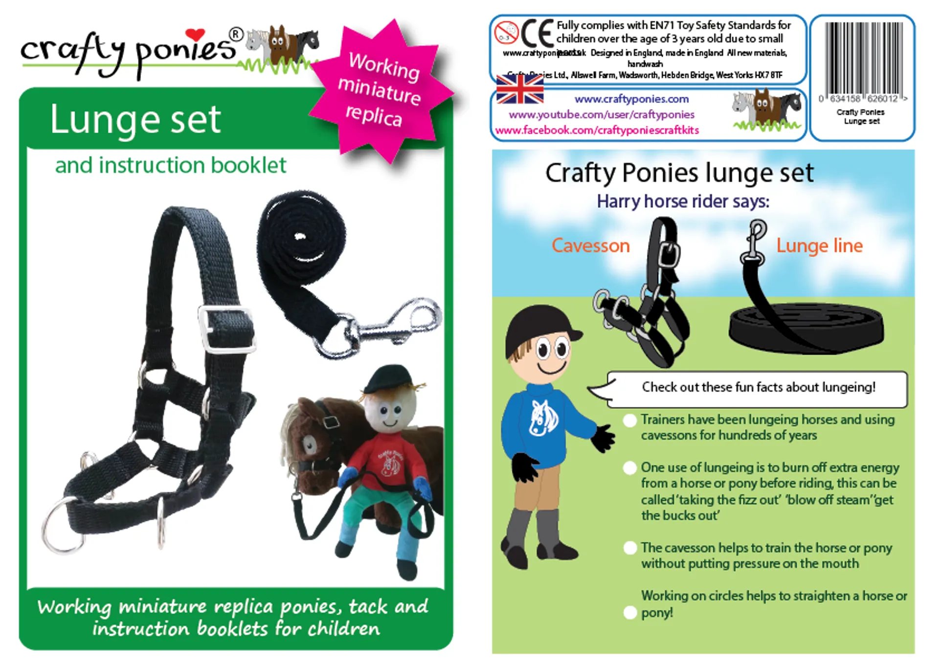 The Crafty Ponies Lunge Set contains a lunge cavesson and lunge line with spring clip and A5 8 page illustrated booklet. The cavesson has three rings so you can adjust where to fasten the lunge line. The Fun illustrated booklet that comes with the crafty ponies lunge set will help you learn about lunging so you can keep your crafty ponies fit and exercised when they can’t be ridden.