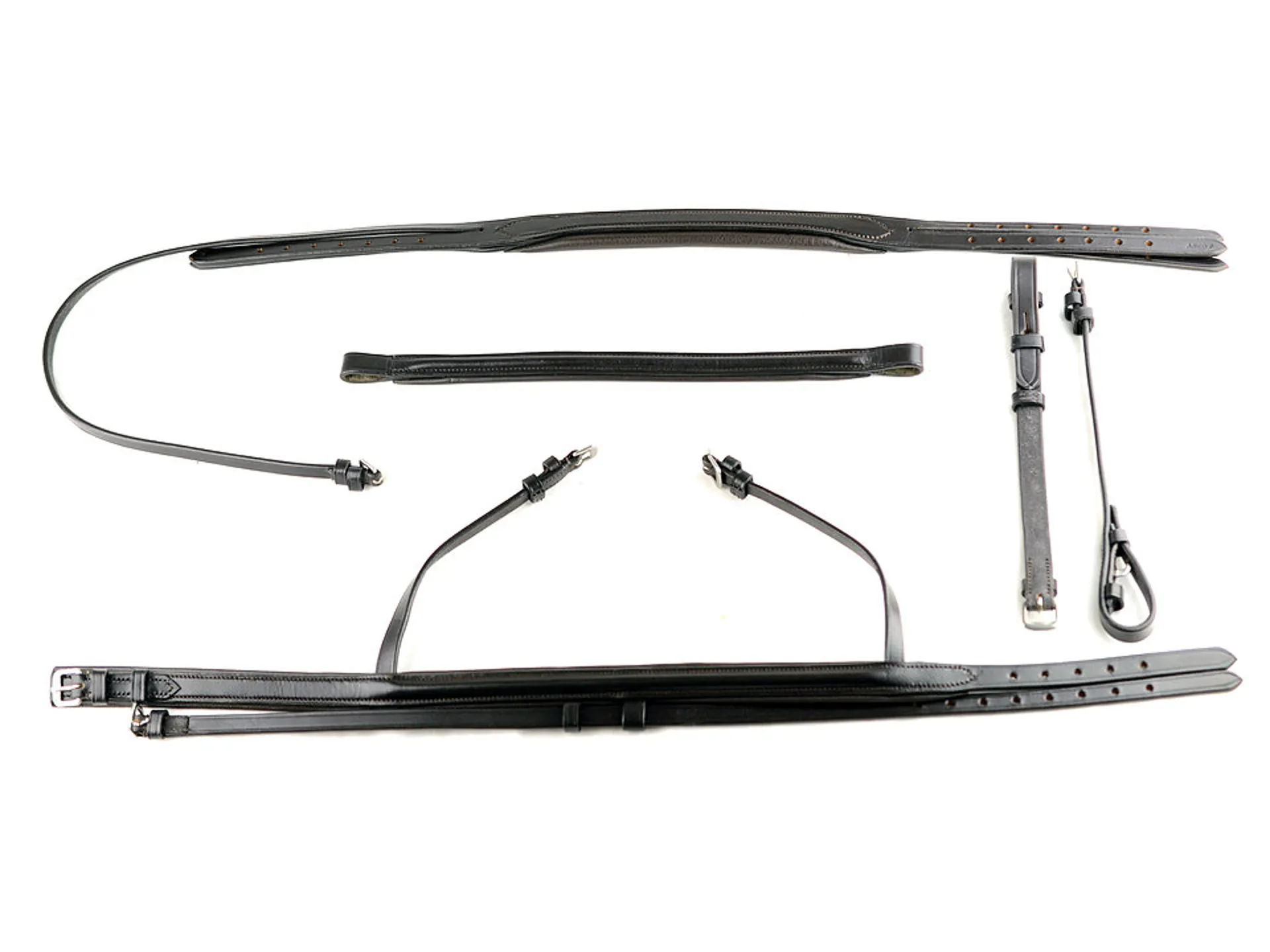 The Noseband has two shorter buckled side straps to attach it to the head piece, and the flash strap helps with bit evasion. The head piece has cheek and noseband straps each side, eliminating the need for an over the head strap on the noseband, and helps avoid unnecessary poll pressure. It also makes the bridle more balanced with even pull to each side.